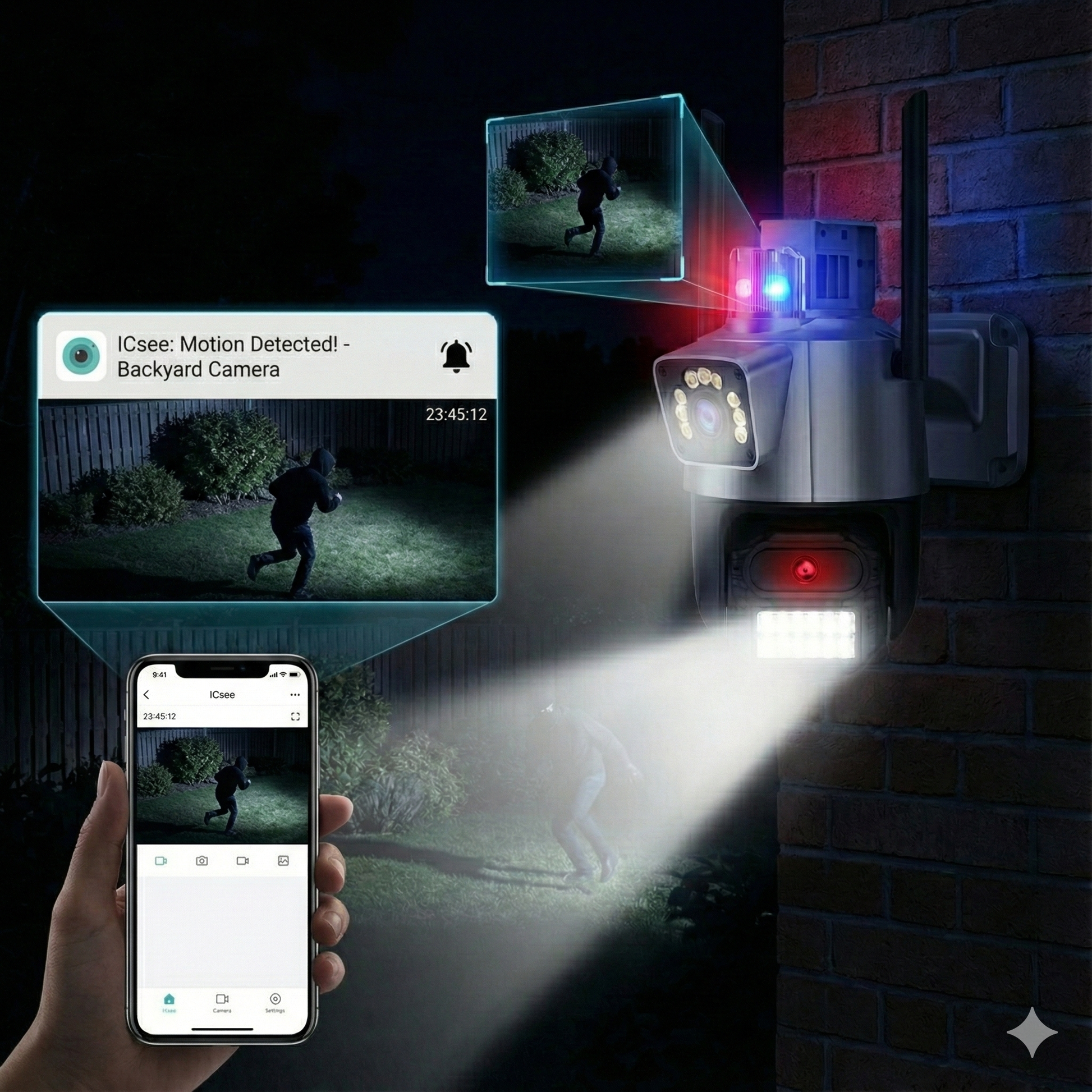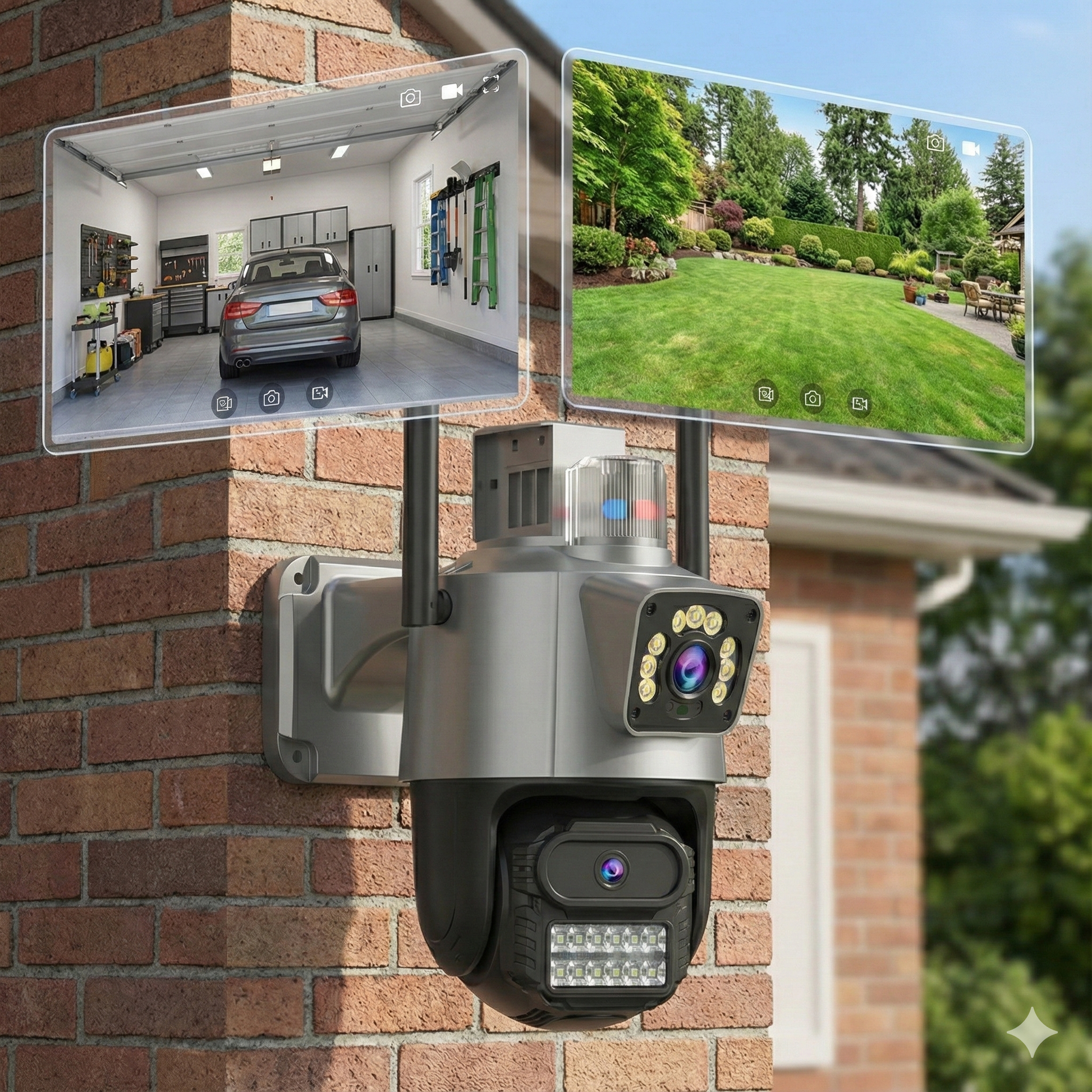 - ✔ Alarme Active: Sistem de alarmă integrat cu detectare sunet și mișcare, plus sirene pentru a alunga intrușii.